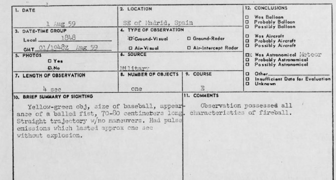 - 01-08-1959. Sureste de Madrid. 18:48 horas Durante aproximadamente cuatro segundos personal militar de EEUU observó desde tierra en la base de Torrejón una especie de bola de fuego del tamaño de una pelota de baseball y de tonalidades amarillas y verdes. El objeto se desplazó con una extraña trayectoria. La investigación concluyó que se trató de un fenómeno astronómico.