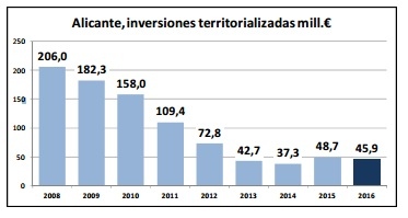 La provincia de Alicante recibirá 45,9 millones de euros en 2016; 5,65 millones de euros menos de los que se le debería asignar si se atiende a la población, explica Ineca en su informe. Incide este lobby empresarial en que ese es precisamente el "mismo criterio que desde el Consell exigen al Gobierno de España". La partida de 45,9 millones de euros se refleja en que cada alicantino recibirá en inversiones 24,5 euros, tres euros menos que la media de la Comunitat y 39,71 euros menos que Castellón, que recibirá 64,3 euros por habitante, según refleja el estudio.