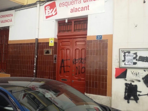 La sede de Esquerra Unida (EU) y del Partido Comunista del País Valenciano (PCPV) en Alicante ha amanecido hoy sábado con varias pintadas en su fachada.