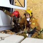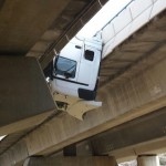 Pasadas las 07:00 horas un camión de gran tonelaje que circulaba por la A-7 colisionó con la mediana de la autovía por causas desconocidas, aunque la colisión pudo deberse al reventón de una de sus ruedas. Como consecuencia del fuerte impacto la cabina se separó del remolque y se desplazó por la carretera 30 metros, quedando encajada finalmente en el hueco del puente y suspendida a 15 metros de altura, según explica Ángel Botía, sargento de los bomberos de Elche, que participó en la coordiación del rescate. Cuando los bomberos llegaron al lugar de los hechos procedieron rápidamente a sujetar la cabina al camión y a la mediana empleando para ello cabestrantes y cadenas. Se trataba de evitar que la cabina se precipitara al vacio con sus dos ocupantes dentro. Una vez quedó asegurada por completo varios bomberos iniciaron el rescate haciendo rappel, tal como explica el sargento Botía. Si la cabina del camión se hubiese desplazado unos metros más, donde el hueco de la mediana se agranda y es de mayores dimensiones, la cabina habría caído con sus dos ocupantes en el interior y las consecuencias habrían sido mucho peores, según apunta el sargento Botía.