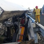 La cabina de un camión que transportaba miles de kilos de bananas quedó encajonada en la mediana de la carretera, y suspendida a una altura de 15 metros del suelo, lo que obligó a los bomberos a activar una complicada operación para rescatar a los dos ocupantes del vehículo.