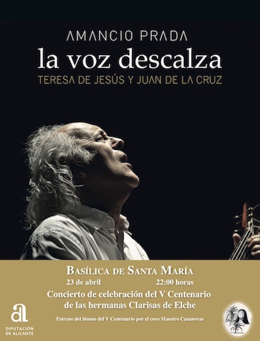 El compositor y cantautor español Amancio Prada ofrecerá el concierto “La voz descalza.Teresa de Jesús y Juan de la Cruz” el sábado, 23 de abril, en la Basílica de Santa María de Elche. Será a las 22:00 horas con entrada libre- El concierto forma parte de los actos conmemorativos del V Centenario de la llegada de las Clarisas a Elche. Se presentará también el himno conmemorativo del V Centenario, interpretado por el Coro Maestro Casanovas.