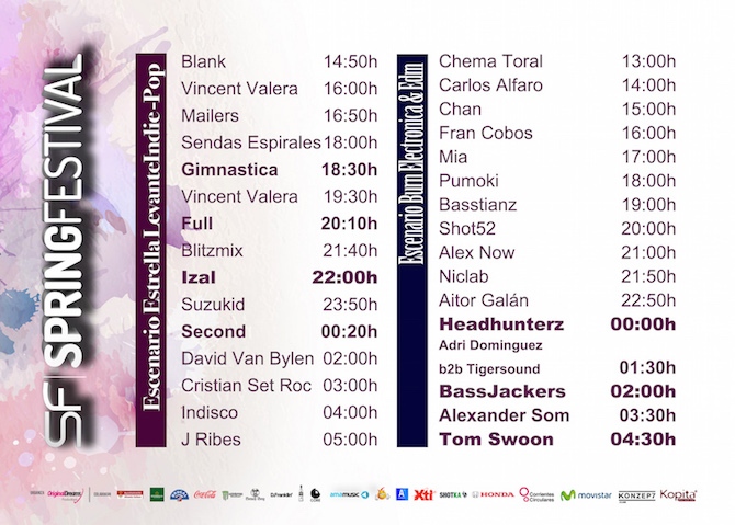 Este es el cartel del Alicante Spring Festival 2016: Headhunterz, Bassjackers, Izal, Tom Swoon, Alexander Som, Second, Aitor Galán, Full, Indisco, Alex Now, Adri Domínguez 2b2 Tiger Sound, David Van Bylen, Cristian Set-Roc, Gimnástica, Mailers Sendas Espirales, Blank, Blitzmix, Vincent Valera, Niclab, Basstianz, Shot 52, Frank Kobos, Chema Toral, Pumoki, Suzukid Dj, J-Ribes, Mia Wallas.