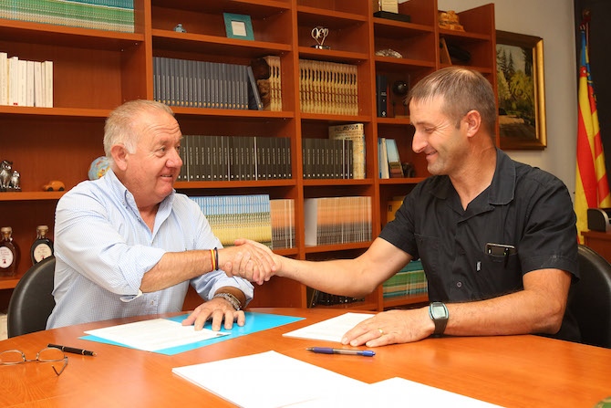El diputado de Fomento, Sebastián Cañadas, ha suscrito un convenio de colaboración (en la imagen) con el presidente del Consejo Regulador de la Indicación Geográfica Protegida Cerezas de la Montaña de Alicante, Hilario Calabuig, para potenciar la promoción, comercialización y certificación del producto. El acuerdo incluye una dotación de 7.500 euros con los que se fomentará la defensa de la calidad de este fruto en el mercado nacional e internacional.