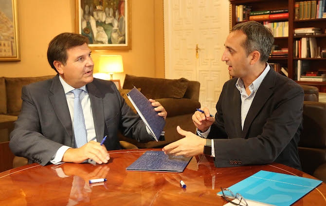 El presidente de la Diputación de Alicante, César Sánchez, y el director comercial de CaixaBank en la Comunitat Valenciana, Felipe Pulido, han firmado hoy el convenio (en la imagen). Sánchez ha valorado la colaboración entre ambas entidades y ha destacado que uno de los principales objetivos es el respaldo a las personas más desfavorecidas, con escasos o nulos recursos.