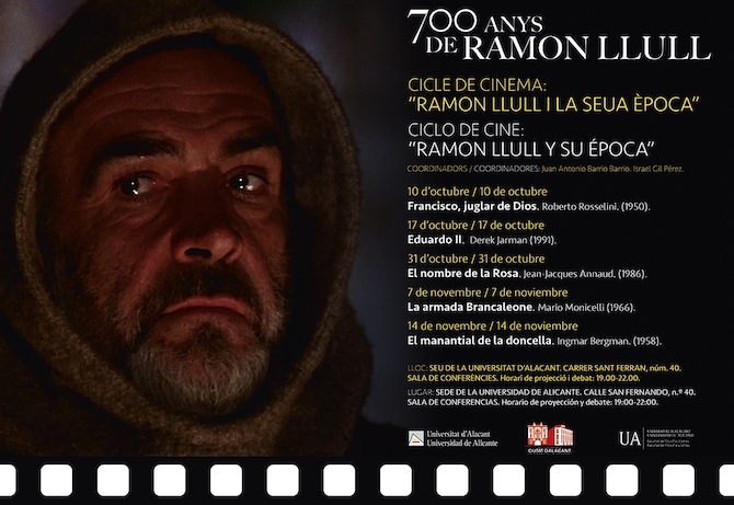 Con el objetivo de contextualizar el periodo histórico comprendido entre el siglo XIII y las primeras décadas del siglo XIV, época histórica del filósofo, poeta, místico, teólogo y misionero mallorquín Ramon Llull, la Universidad de Alicante ha organizado un ciclo de cine en versión original bajo el título "Ramón Llull y su época", coordinado por Israel Gil y Juan Antonio Barrio.