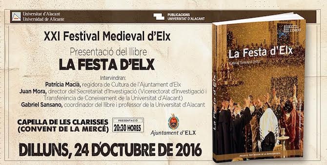 El lunes 24 de octubre se presenta La Festa d'Elx un el nuevo libro de la colección de divulgación científica L'Ordit, que edita Publicaciones Universidad de Alicante. Será a las 20.30 horas en la Capilla de las Clarisas del Convento de la Mercé en Elche. Intervendrán Patricia Macià, concejal de Cultura del Ayuntamiento de Elche; Juan Mora, director del Secretariado de Investigación de la UA; y Gabriel Sansano, coordinador del libro.