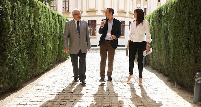 El presidente del Patronato del Misteri ha aprovechado su visita al Palacio Provincial para recorrer sus jardines y el Rincón de los Ilustres guiado por el presidente de la Diputación (en la imagen).