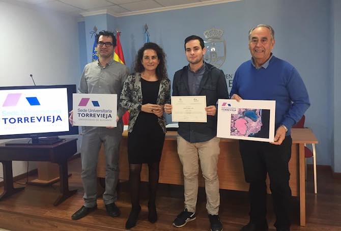 El acto de entrega (en la imagen de arriba) ha contado con la asistencia de Eva Valero, directora del Secretariado de Sedes Universitarias de la UA y José Norberto Mazón, coordinador académico de la Sede de Torrevieja, además del galardonado, que ha recibido un premio de 450 euros.