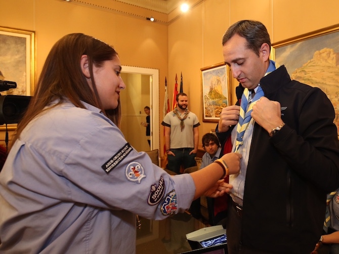Con motivo de este evento, los grupos scouts ‘Resurrección de Alicante’ y ‘Nazaret’ de Sant Vicent del Raspeig han visitado la sede de la institución provincial para reunirse con el presidente, César Sánchez, a quien le han hecho entrega de un diploma de agradecimiento como reconocimiento a su labor de defensa del medio ambiente, compromiso social, formación cívica e impulso del movimiento asociativo. También le han otorgado la pañoleta scout propia del grupo alicantino (en la imagen).