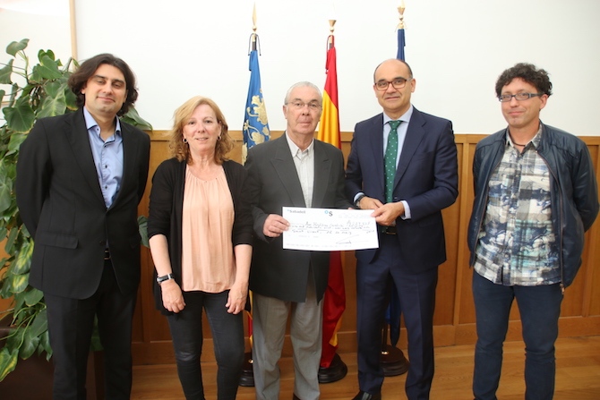 El rector de la Universidad de Alicante (UA), Manuel Palomar, ha entregado a Vicente Torres el cheque solidario del concierto de la Orquesta Filarmónica de la UA. Vicente Torres es presidente de la Asociación de Paralíticos Cerebrales de Alicante (APCA).
