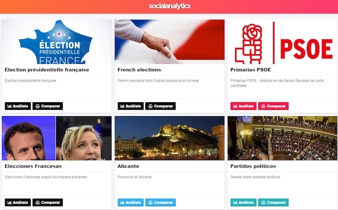 Social Analytics es una aplicación que recupera mensajes de usuarios de las redes sociales Twitter e Instagram sobre un tema en concreto y, de forma automática, valora las opiniones expresadas en los mensajes. Esto permite realizar un seguimiento de las opiniones de la gente sobre diferentes temas como, por ejemplo, un destino turístico o unas elecciones como es este caso. Este análisis puede representarse tanto geográficamente en un mapa como con gráficos.