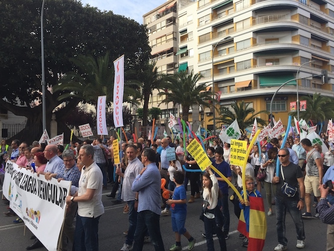 Miles de madres y padres han vuelto a pisar las calles de Alicante para defender su derecho a elegir la lengua en la que quieren que estudien sus hijas e hijos y contra las imposiciones del conseller Vicent Marzá. "La lengua ni se prohibe ni se impone", "Ante la imposición, oposición", "No a la imposición lingüística" y "Por una educación en libertad" han sido algunos de los lemas de las pancartas y carteles que se han exhibido en la manifestación.