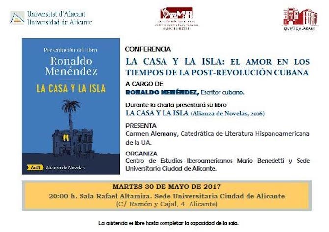 El Centro de Estudios Iberoamericanos Mario Benedetti de la Universidad de Alicante (UA) y la Sede Ciudad de Alicante organizan la presentación del libro "La casa y la Isla", del escritor cubano Ronaldo Menéndez (Cuba,1970). El acto será el martes 30 de mayo a las 20:00 horas, en la Sala Altamira de la Sede en Ramón y Cajal, 4. Carmen Alemany, catedrática de Literatura Hispanoamericana de la Universidad de Alicante, será la encargada de presentar al autor y su publicación.