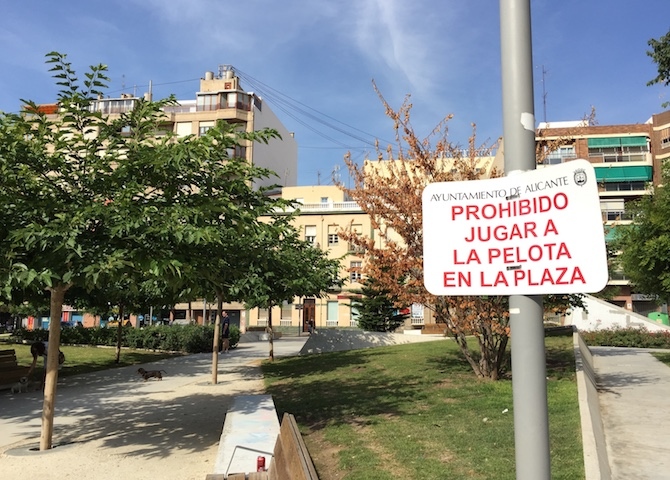El Ayuntamiento de Alicante mantiene una estricta política sobre los juegos de pelota en los parques de la ciudad y por ello ha colocado carteles advirtiendo a los menores y a sus madres y padres de la prohibición de darle patadas a un balón. Un rigor que no existe, sin embargo, para recordar a los propietarios de perros que la ordenanza obliga a que los lleven con correa.
