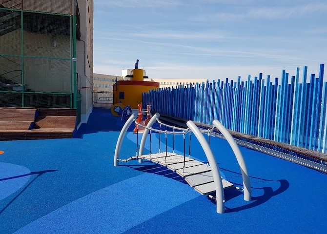El diseño, realizado por el estudio Zenital, ha sido innovador para permitir que las niñas y niños ingresados dispongan de un gran espacio lúdico, diferente del clásico parque. Hay un pequeño submarino, una ballena, un barco, un puente, una tabla de surf y una boya. Además, hay zonas de descanso tipo chill out y una canasta. Seguro que Juanín disfrutaria jugando y contemplando a otras niñas y niños dando vueltas por su parque.