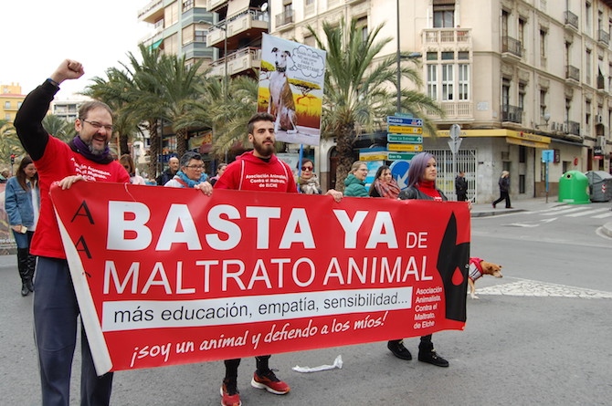 La manifestación de Alicante ha recorrido las principales calles del centro de la ciudad. Algunos de los manifestantes han acudido con sus galgos. Las pancartas tenían lemas como "Cazador tu locura es su muerte", "Basta ya de maltrato animal" y "No a la caza con galgos y otras razas". Otros manifestantes portaban crudas imágenes de animales tras haber sido cazados.