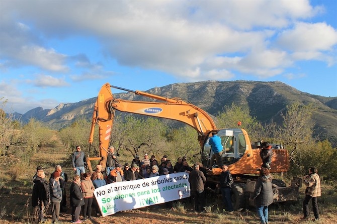 La Plataforma de Afectados y Jóvenes Agricultores Asaja Alicante han solicitado a la Generalitat que primero arranquen los almendros de las parcelas abandonadas y no entren en fincas donde los propietarios se han negado al triturado de sus árboles. La razón que exponen es que se han presentado recursos contencioso administrativos y que prevén que el juez dicte la suspensión cautelar de los arranques.