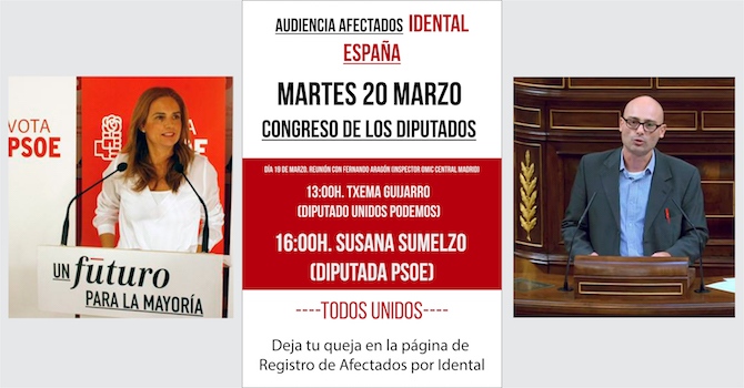 Por la tarde los representantes de loas afectados se reunirán con la diputada del PSOE Susana Sumelzo. Esta reunión ha sido posible porque Mery Alves, una afectada de iDental que reside en Zaragoza, denunció su situación. Esta denuncia se realizó a través de una campaña en la plataforma de incidencia social y política osoigo.com. Según explican los afectados Susana Sumelzo respondió a través de la misma plataforma: “me gustaría poder escucharles y que me trasladasen en persona lo ocurrido y la situación en que se encuentra. Intentaremos ayudarles en lo que sea posible desde mi responsabilidad en el Congreso”.