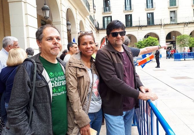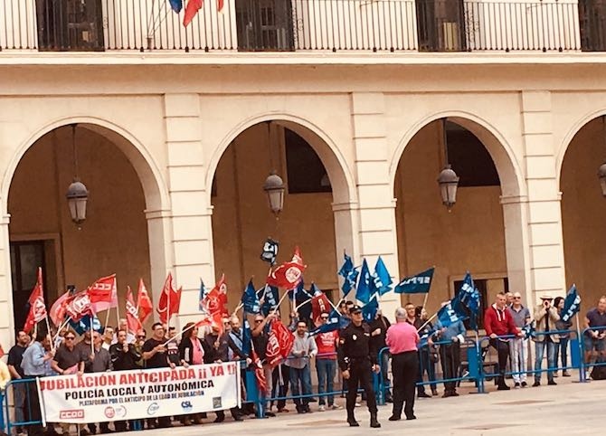 Pavón, junto a los concejales de Guanyar Víctor Domínguez y Julia Angulo se ha concentrado frente al Ayuntamiento de Alicante, donde el presidente del Gobierno ha sido recibido a su llegada con una sonora pitada por parte de un centenar de personas agrupadas tras un cartel con el lema: "Jubilación anticipada ya. Policía Local y Autonómica".