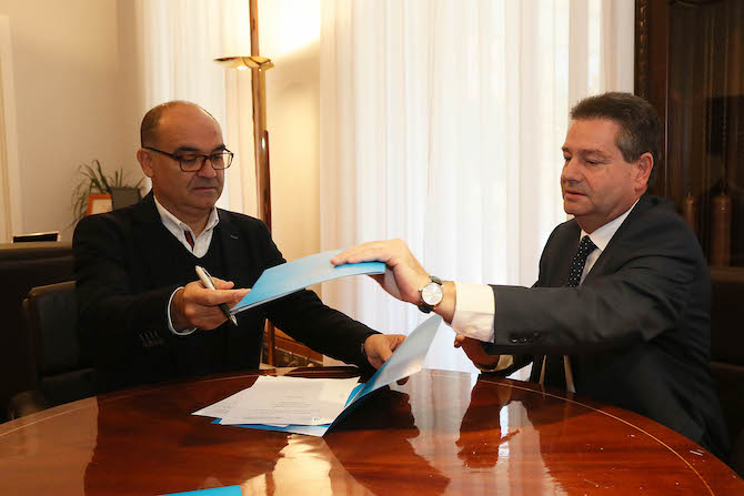 El diputado de Ciclo Hídrico, Francisco Sáez, y el rector de la Universidad de Alicante (UA), Manuel Palomar, han firmado esta mañana el convenio de colaboración por el que la institución provincial aportará 40.000 euros para subvencionar este proyecto a lo largo de los próximos meses.