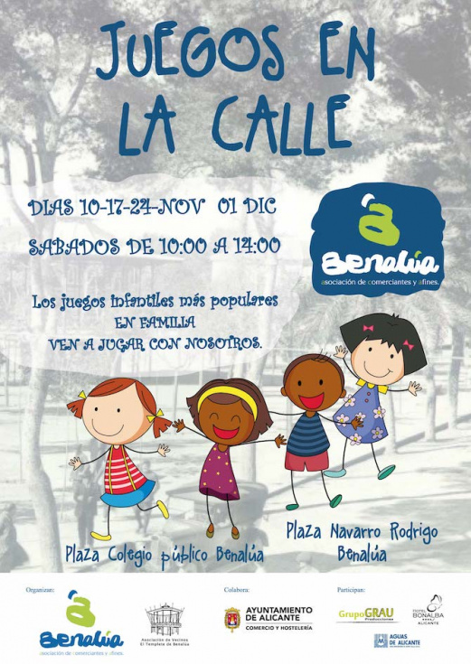 Los Juegos en la calle darán comienzo el sábado 10 con una chocolatada, que cuenta con la empresa y los monitores de Eventos Grau para canalizar dichos encuentros. Se invitará a los niños y niñas a tomar parte y se tratará de formar equipos para pasar unas mañanas divertidas, señala Pelluch. El horario será de 10:00 a 14:00 horas, durante cuatro sábados (10, 17 y 24 de noviembre y 1 de diciembre). También habrá sorteos de camisetas y regalos especiales, como algunos fines de semana a disfrutar en el Hotel Bonalba.