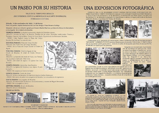 El sábado 10 de noviembre tendrá lugar un itinerario cultural, con ayuda de la asociación Alicante Vivo y del Grupo Peripatéticos.