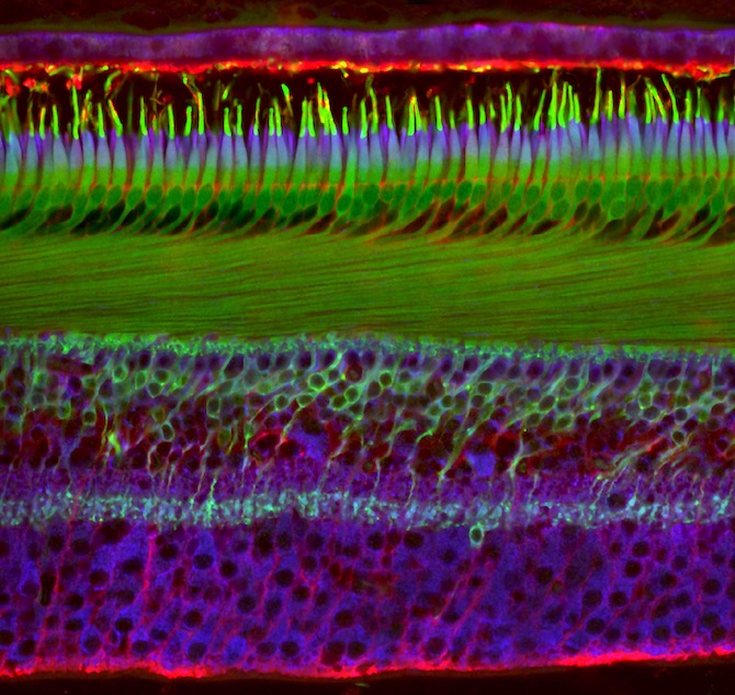Una imagen que muestra el corte transversal de una retina humana realizada por los investigadores del Departamento de Fisiología, Genética y Microbiología de la Universidad de Alicante, Nicolás Cuenca e Isabel Ortuño-Lizarán, ha sido seleccionada en el Top 20 de la competición 'Nikon Small World 2018'.