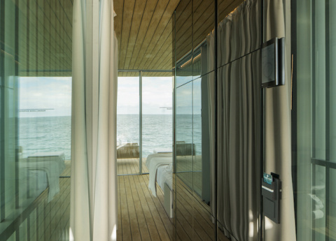 Un punto destacado de este pabellón flotante es que el cerramiento es 100% de vidrio. Fabricado por Guardian Glass, no tiene tonalidad y su avanzada tecnología consigue que, desde el interior de Punta de Mar, la percepción del entorno, como el mar o la naturaleza, sea mucho más real y que en las paredes interiores se refleje el exterior consiguiendo así un efecto de inmersión en el entorno.