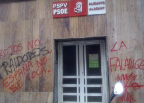 Sedes del PSOE, Compromís, Podemos y EU en diversos barrios de Alicante han amanecido con varias pintadas con lemas en los que se acusa a estas formaciones de "rojos" y de ser traidores a España. Las pintadas están firmadas por "la Falange".