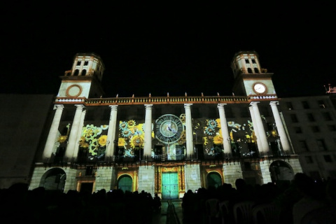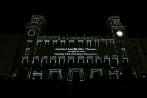 El Ayuntamiento de Alicante y Vectalia han proyectado esta tarde en la fachada del consistorio la película "Una Navidad Alicantina". Se trata de la primera proyección en formato Videomapping.