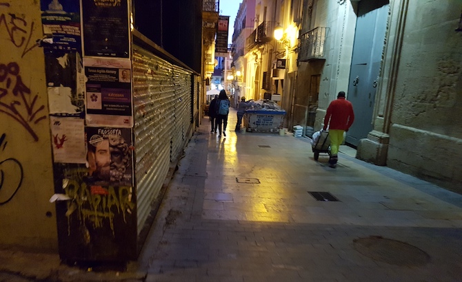 El delito fue perpetrado en el casco antiguo de Alicante (el barrio) durante la madrugada de Halloween del año 2015, cuando uno de los acusados llevaba una máscara y el otro llevaba una túnica y la cara pintada de blanco.
