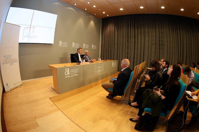 El presidente de la Diputación de Alicante, César Sánchez, y el de la Real Academia de Gastronomía, Rafael Ansón, han presentado hoy, en rueda de prensa, las actividades que se enmarcan dentro de la designación de Alicante como 'Capital Gastronómica del Mediterráneo 2019'.