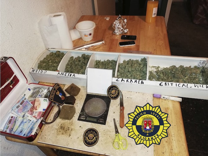 Agentes de la Policía Local de Alicante desmantelaron ayer sábado un 'narcopiso' en el barrio de Juan XXIII (Pasaje Poeta Villaespesa). En el inmueble se decomisaron 1,5 kilos de marihuana y 160 gramos de hachís, así como una báscula de precisión y dinero en efectivo. La droga estaba siendo vendida a menores de edad, según explican desde la Concejalía de Seguridad.