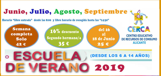 La Escuela de Verano "Cocinando sonrisas" se desarrollará en el Centro Educativo de Recursos de Consumo de Alicante (CERCA) del 26 de junio al 6 de septiembre, con un horario de 08:00 a 14:30 horas.
