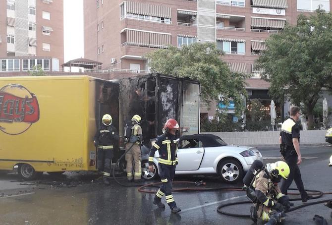Vehículo ardiendo en la glorieta Deportista Sergio Cardell.Los bomberos del Ayuntamiento de Alicante (SPEIS) han extinguido esta mañana un aparatoso incendio originado al impactar un vehículo contra un camión en la glorieta Deportista Sergio Cardell, junto a la avenida de Miriam Blasco en la playa de San Juan.
