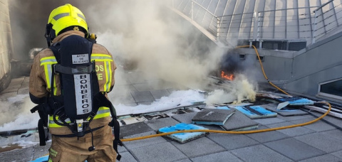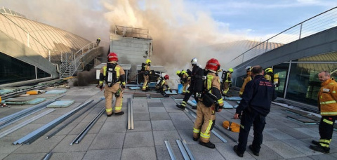 Cerca de medio centenar de bomberos de la Diputación de Alicante, el Ayuntamiento y del parque del propio aeropuerto de Alicante-Elche trabajan desde pasadas las 14:00 horas en la extinción de un incendio originado en una de las cubiertas de la terminal.