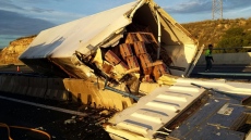La cabina de un camión que transportaba miles de kilos de bananas quedó encajonada en la mediana de la carretera, y suspendida a una altura de 15 metros del suelo, lo que obligó a los bomberos a activar una complicada operación para rescatar a los dos ocupantes del vehículo.