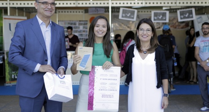 La Universidad de Alicante (UA) ha entregado esta mañana a Nuria García Brea, estudiante de Derecho y Administración y Dirección de Empresas (DADE), el premio del concurso ‘Un lema para la UA’ por su propuesta ‘Apuesta por ti’. Nuria ha recibido el galardón de manos del rector de la UA, Manuel Palomar, y de la vicerrectora de Estudiantes, Nuria Grané.