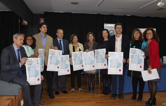 La presentación del concierto extraordinario de la OFUA ha tenido lugar hoy en el Teatro Principal de Alicante y ha contado con la presencia de Carles Cortés, vicerrector de Cultura, Deportes y Política Lingüística de la UA; Julia Angulo, concejal de Acción Social del Ayuntamiento de Alicante; Carlos Vilchez, director de zona de Alicante del Banco Sabadell; Mónica Martí, vicepresidenta de la Fundación General de la UA y vicerrectora de Planificación Económica;h Nito Manero, presidenta APSA, y Sofía Blasco, directora de la Fundación Marjal. El acto ha contado también con la asistencia de Concha Aldave, directora de la Fundación Manuel Peláe y Miguel Ángel Benito, director Territorial de Alicante de Hidraqua, entidades patrocinadoras anuales de la orquesta junto a Vectalia.