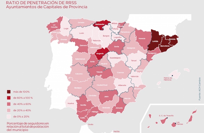 En el cojunto de España, de los ayuntamientos analizados los que mejor Ratio de Penetración tienen en redes sociales son Barcelona (183%), Girona (139%) y Lleida (123%), cuyos followers en los distintos canales sociales superan ampliamente el número de habitantes censados en las capitales catalanas. El Top 10 del Ratio de Penetración de RRSS lo completan, según el estudio de esta consultora, los ayuntamientos de Santander (78%); Segovia (69%); La Coruña (59%); Ávila (56%); Tarragona (55%); San Sebastián (54%) y Toledo (50%). De forma inversa, los ayuntamientos que aparecen en la base del ranking son Huelva (7,9%), Valencia (5,9%), Guadalajara (5,1%), Teruel (4,4%) y Bilbao (2,9%).