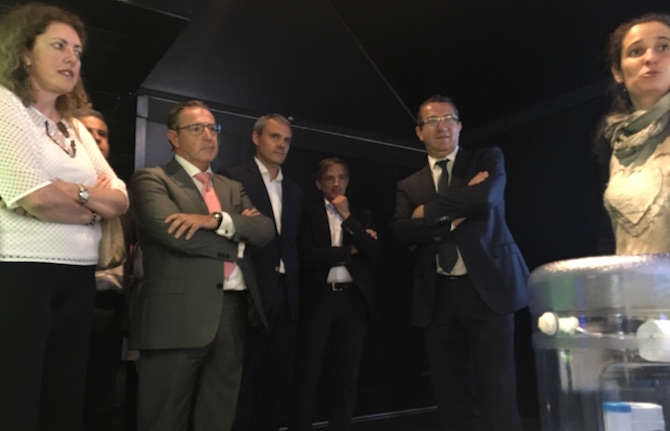 Antonio Pérez, alcalde de Benidorm, Emilio Vicente Juan de Merlo, director de Área de Negocio de CaixaBank en Benidorm, Miguel Ángel Benito, director de Concesiones de Hidraqua, han presentado hoy la nueva exposición ¡H2Oh! Los secretos del agua de tu ciudad en Benidorm.