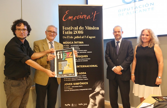 El Festival Internacional de Jazz ha sido presentado hoy por el diputado de Cultura, César Augusto Asencio; el concejal de Cultura de Alicante, Daniel Simón; la responsable de la empresa adjudicataria de la organización del evento, Amparo Tébar; y el director de Zona de Alicante de Banco Sabadell, Carlos Vilchez.