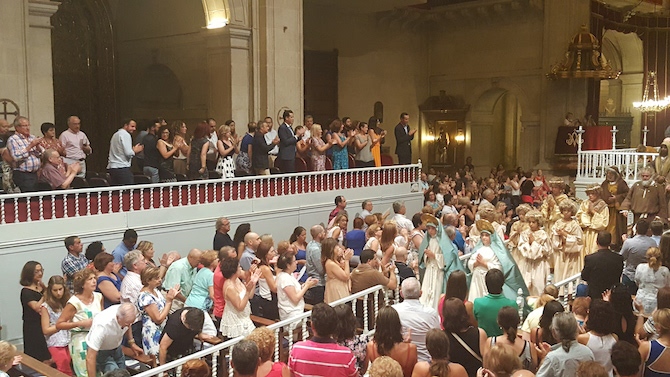 El miércoles 10 de agosto, con la Basílica llena, es la Prova de l’Àngel. Los niños bajan desde el cielo abierto por primera vez, es una prueba de altura, en todos los sentidos. Los movimientos del escenario aéreo del Misteri a través de la Magrana, el Araceli, la Coronación reproduce, como antesala, lo que ocurrirá 24 horas después. Unos aparatos que descienden desde una altura de más de 25 metros que a mí me da la sensación que son más.