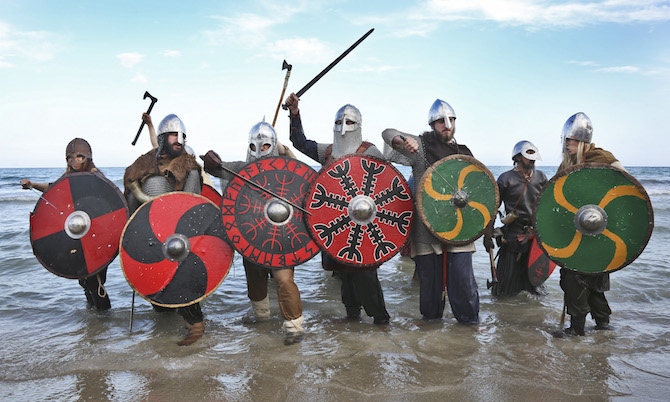*Imagen superior: Un grupo de 'vikingos', durante el desembarco que realizaron en la playa del Postiguet dentro de la campaña de difusión de la exposición “Vikingos. Guerreros del Norte. Gigantes del Mar”.