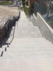 - Un itinerario peatonal mediante escalera. Frente a la fachada de los colegios se ha realizado un itinerario peatonal que conecta la acera existente junto al colegio Gloria Fuertes en la calle Cuarzo y la acera del colegio Santísima Faz, en la calle Turquesa, mediante una zona pavimentada y una escalera que salva un desnivel de 12 metros.
