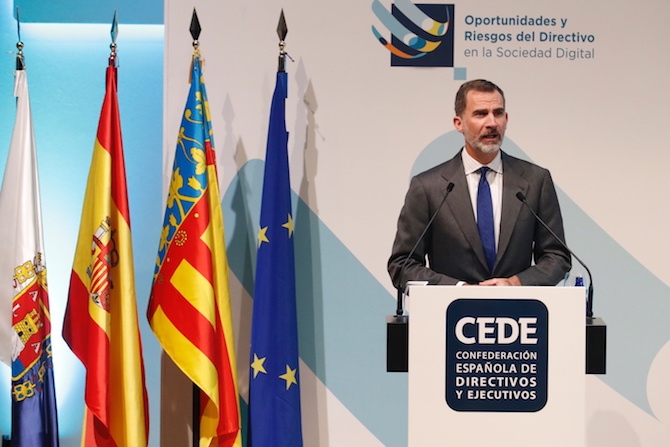 Isidro Fainé, Presidente de la Fundación Caixa y de la CEDE, ofreció la Presidencia de Honor de esa Confederación al Rey como reconocimiento y respaldo a la Monarquía manifestado “Majestad, usted es, sin duda, el primer directivo del país y lo demuestra día a día en el ejercicio de su responsabilidad, con determinación y compromiso, potenciando la imagen y valor de nuestras empresas en todo el mundo. Le sentimos cerca y agradecemos su liderazgo y por ello que tengo el honor de trasladarle la petición de la Junta Directiva”.