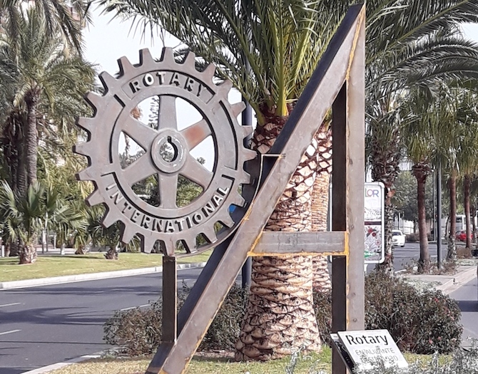 El pasado jueves 1 de febrero todos los clubes rotarios de Alicante, denominados (por orden alfabético) Alicante, Alicante Centro, Alicante Costa Blanca, Alicante Lucentum y Alicante Puerto, compartieron su emblema con la sociedad –con la instalación de una escultura metálica al aire libre– acompañada a sus pies de una placa cuya leyenda manifiesta que Rotary está en Alicante desde 1930. En una de sus calles más transitadas, la avenida Loring frente a la nueva estación de autobuses. Para los rotarios este acto de la instalación de la rueda rotaria es un gesto de agradecimiento hacia esa sociedad que se ha sensibilizado con ellos para emprender multitud de acciones solidarias, también de humildad por todo lo que se ha hecho y de lo que todavía queda por hacer. Su lema es “dar de sí sin pensar en sí”.