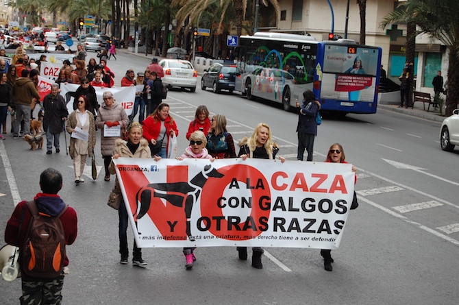 La manifestación de Alicante ha recorrido las principales calles del centro de la ciudad. Algunos de los manifestantes han acudido con sus galgos. Las pancartas tenían lemas como "Cazador tu locura es su muerte", "Basta ya de maltrato animal" y "No a la caza con galgos y otras razas". Otros manifestantes portaban crudas imágenes de animales tras haber sido cazados.