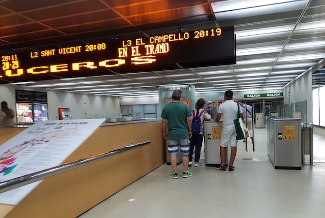 Entre estos convoyes se encontrarán las tres últimas circulaciones que parten de Benidorm (22:35, 22:55 y 23:25 horas) y que concluyen normalmente su viaje en Pueblo Español, y que el sábado continuarán su marcha hasta Luceros con parada facultativa en todos los apeaderos, excepto Sangueta, como hace la L-3.